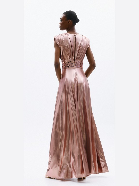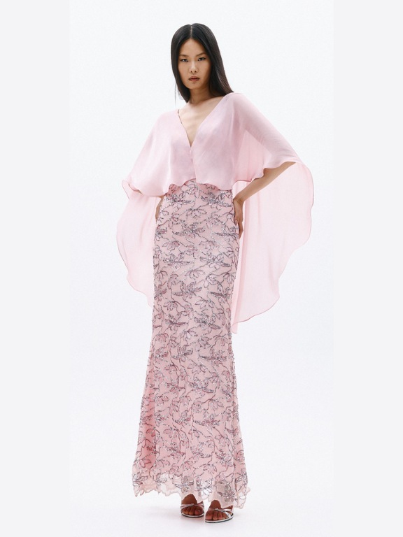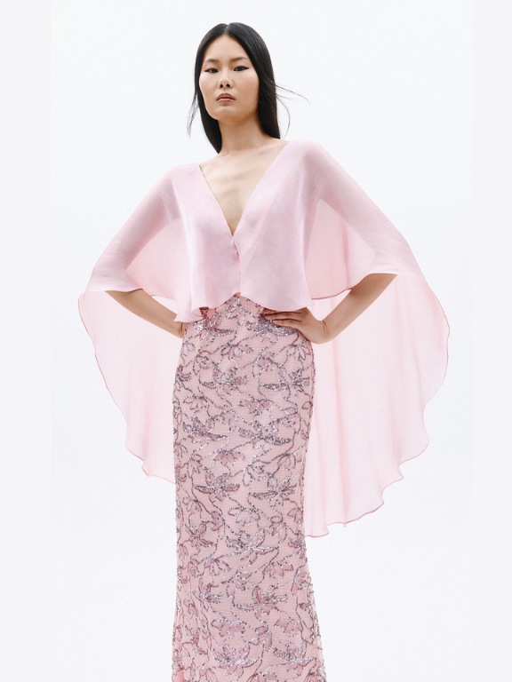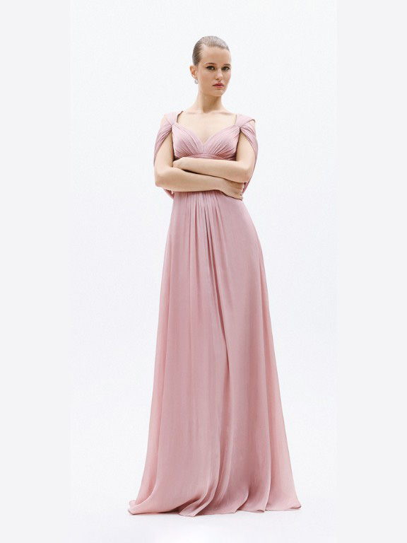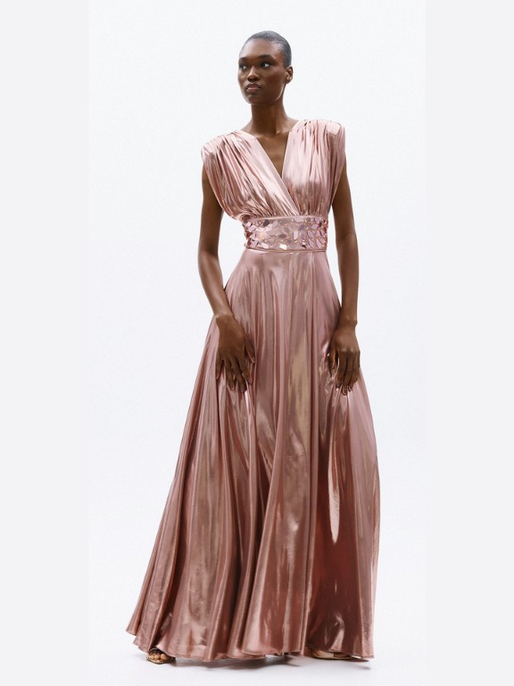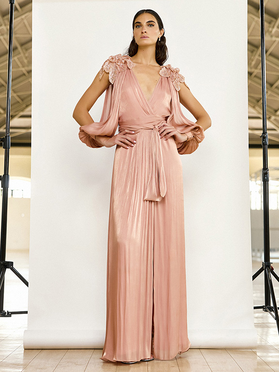 Το φόρεμα είναι μακρύ σε απαλό ροζ σαμπανιζέ χρώμα, με βαθύ V ντεκολτέ και αέρινη γραμμή. Στους ώμους υπάρχουν εντυπωσιακές διακοσμητικές λεπτομέρειες με παγιέτες σε σχήμα λουλουδιών. Τα μακριά, φαρδιά μανίκια και η ζώνη στη μέση δημιουργούν ένα ρομαντικό και πολύ κομψό αποτέλεσμα. -