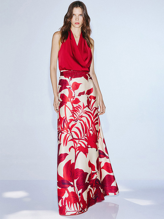 Το σύνολο αποτελείται από κόκκινο τοπ με ντραπέ ντεκολτέ και αμάνικο σχέδιο.Συνδυάζεται με μακριά φούστα σε εκρού βάση με μεγάλα κόκκινα τροπικά μοτίβα.Η εφαρμοστή μέση και η αέρινη γραμμή της φούστας δημιουργούν ένα κομψό και εντυπωσιακό αποτέλεσμα