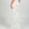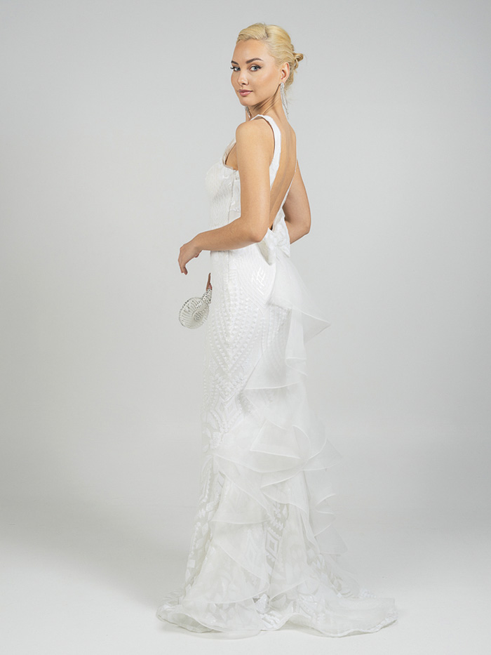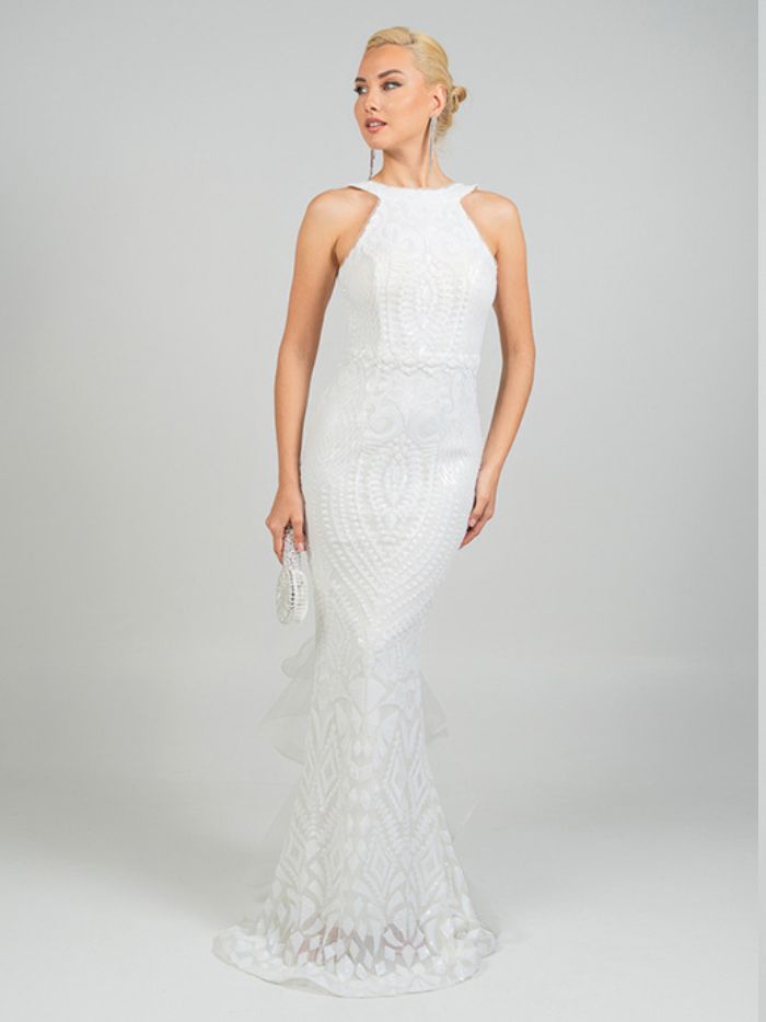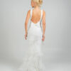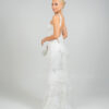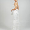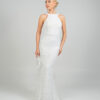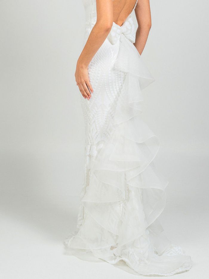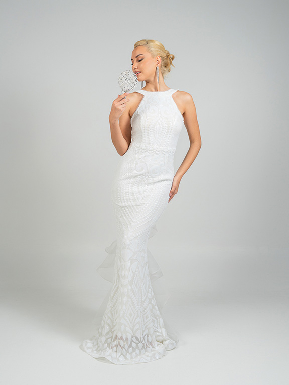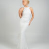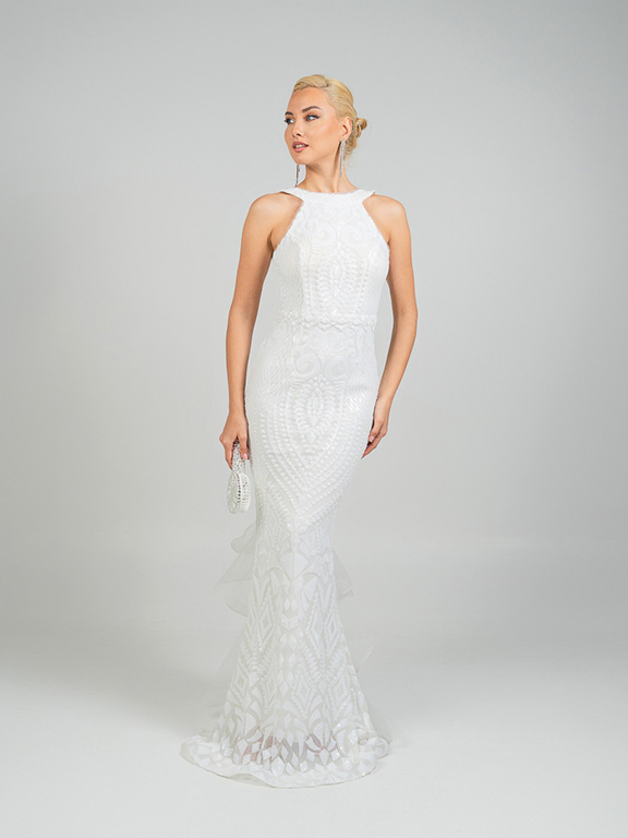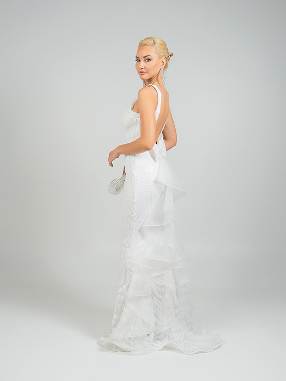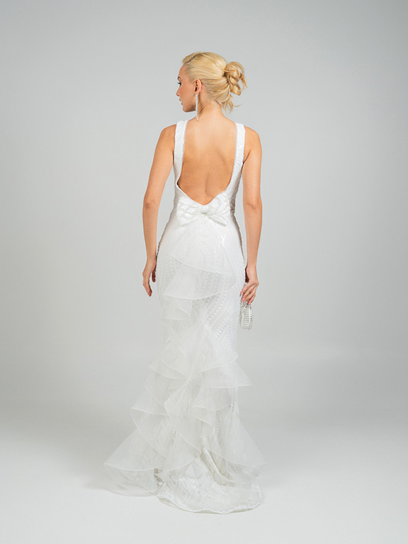 Eντυπωσιακό νυφικό  με ψηλό λαιμό  αφήνοντας τους ώμους γυμνούς . Το μπούστο είναι εφαρμοστό και διακοσμημένο με περίτεχνα μοτίβα από δαντέλα και κέντημα, που συνεχίζονται αρμονικά σε όλο το μήκος του φορέματος. Η γραμμή είναι τύπου γοργονέ,  στενή μέχρι τους μηρούς και ανοίγει διακριτικά προς το τελείωμα, δημιουργώντας  μια αέρινη ουρά με διακριτικά βολάν και λεπτομέρειες από διαφανές ύφασμα που δίνουν κίνηση και ρομαντισμό. Η πλάτη του φορέματος είναι ανοιχτή,  ενώ υπάρχει ένας μεγάλος διακοσμητικός φιόγκος.