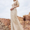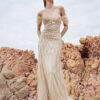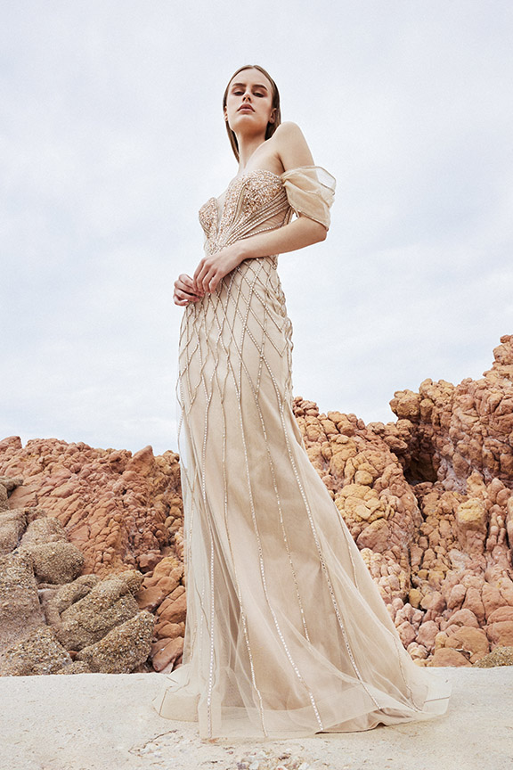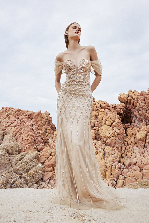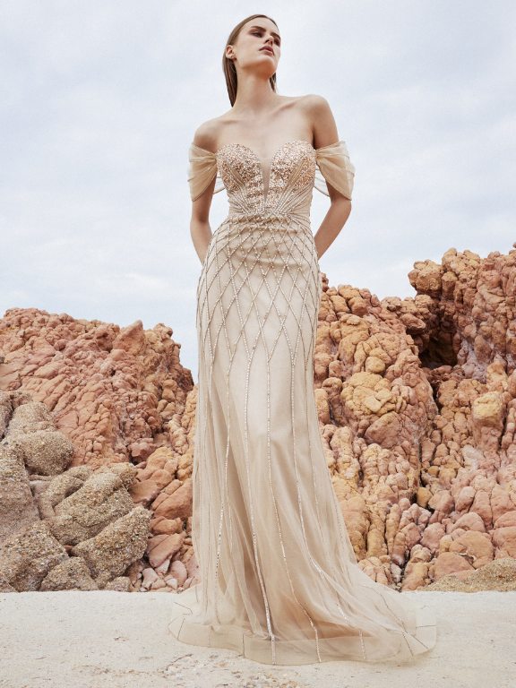Εντυπωσιακό maxi φόρεμα σε απόχρωση beige με strapless μπούστο και διακριτικά μανίκια από τούλι που αγκαλιάζουν τους ώμους. Μοναδικές λαμπερές παγιέτες και γεωμετρικά μοτίβα αναδεικνύουν το βραδινό φόρεμα.