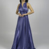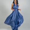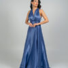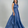 Μια κομψή μακριά μπλε τουαλέτα με βαθύ V ντεκολτέ και φαρδιές τιράντες. Το φόρεμα διαθέτει εφαρμοστή μέση και ρέουσα φούστα από ελαφρώς γυαλιστερό ύφασμα, προσδίδοντας αέρινη κίνηση και εκλεπτυσμένη εμφάνιση.