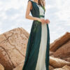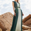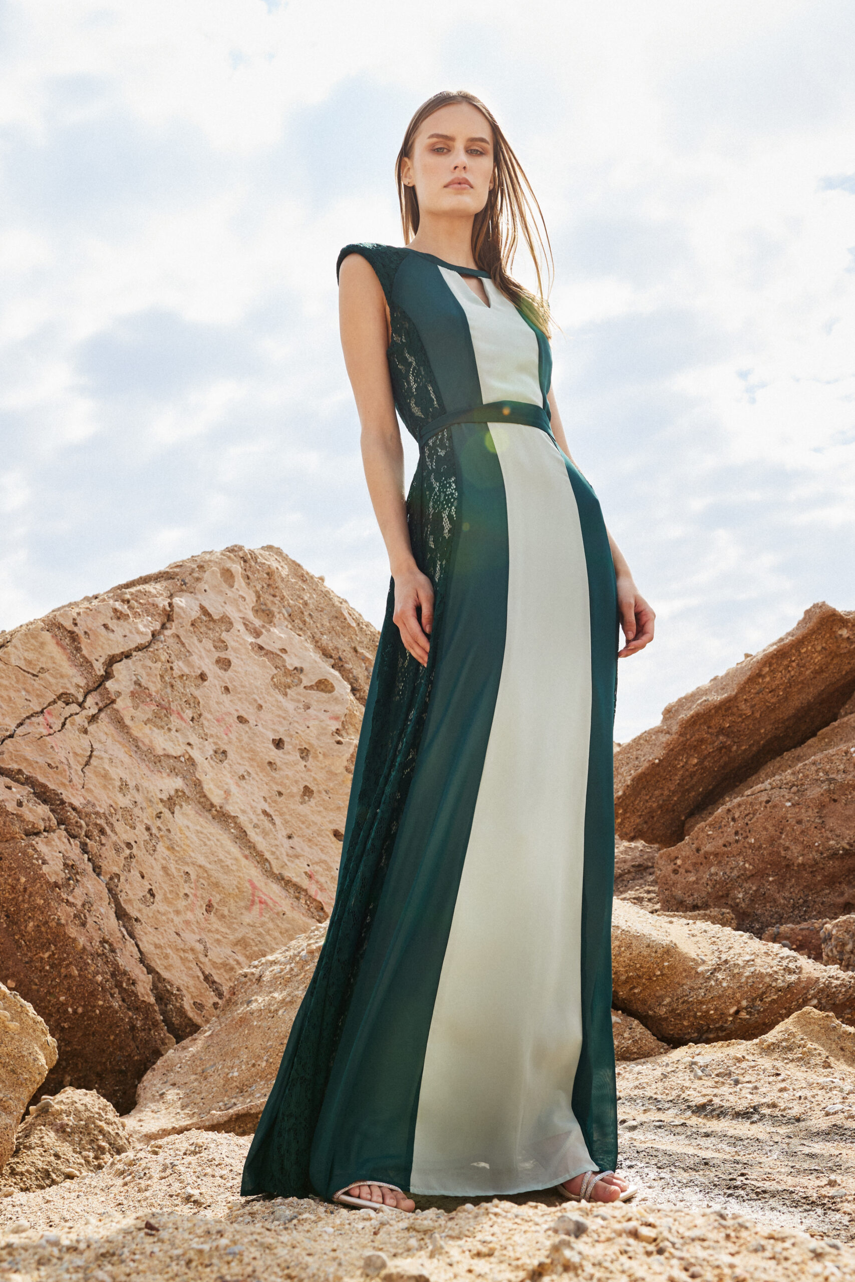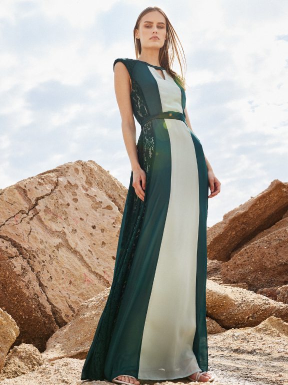 Εντυπωσιακό πράσινο δίχρωμο maxi φόρεμα με ιδιαίτερες δαντελένιες λεπτομέρειες στα πλαινά.
