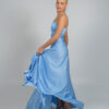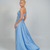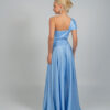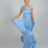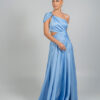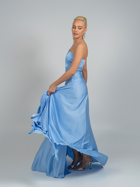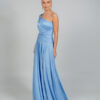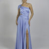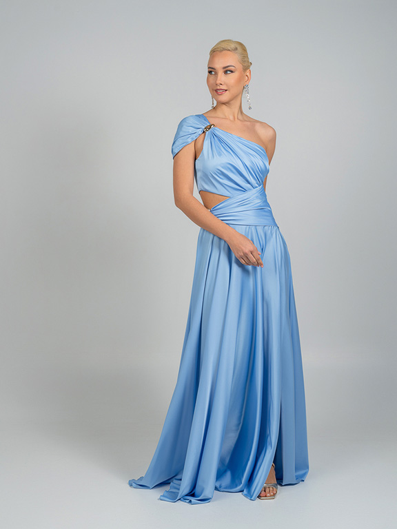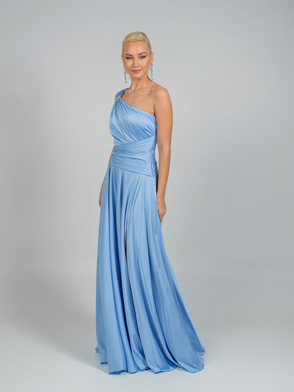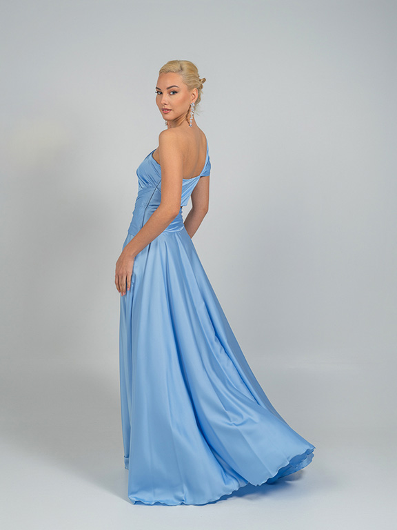 Μια μοντέρνα κομψή μακριά γαλάζια τουαλέτα με ασύμμετρο σχέδιο στον έναν ώμο. Το φόρεμα διαθέτει ντραπέ λεπτομέρειες στο μπούστο και τη μέση, διακριτικά κοψίματα στο πλάι και ένα ψηλό σκίσιμο στο πόδι, χαρίζοντας θηλυκότητα και μοντέρνα αισθητική.