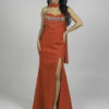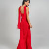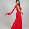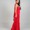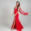 Εντυπωσιακό μακρύ φόρεμα σε έντονο κόκκινο με στράπλες μπούστο διακοσμημένο με λαμπερές λεπτομέρειες.