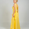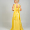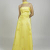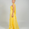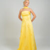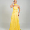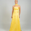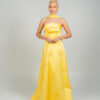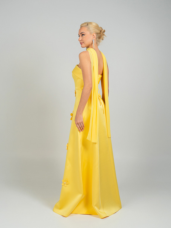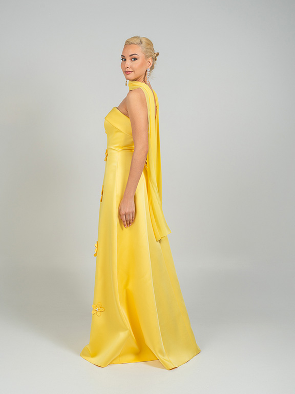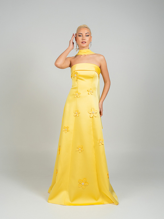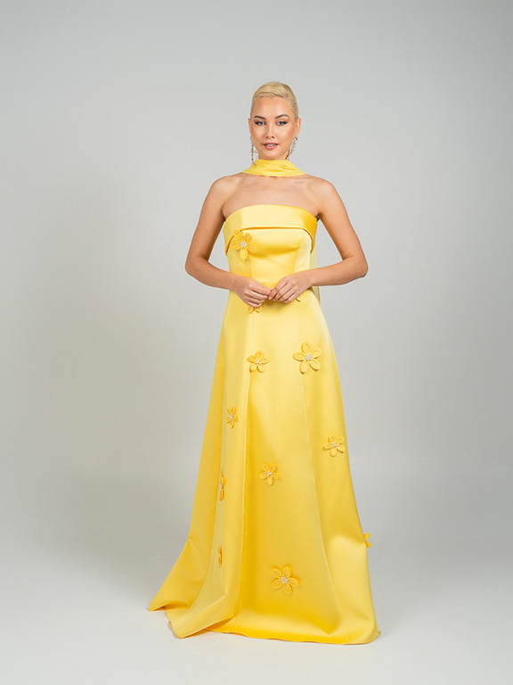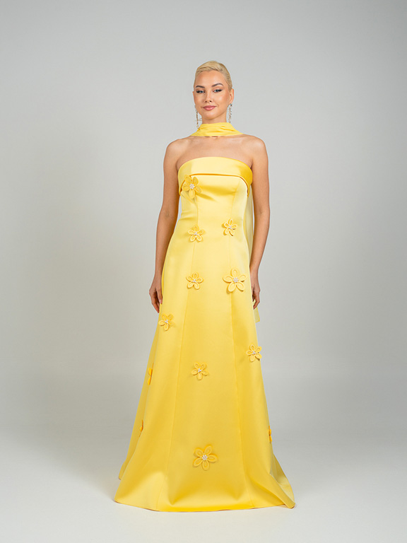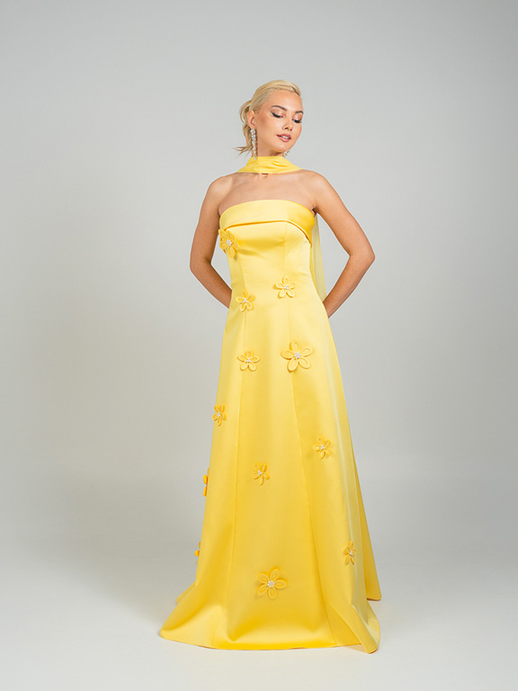 Μια κομψή μακριά κίτρινη τουαλέτα με στράπλες σχέδιο, διακοσμημένη με μικρά λουλουδάκια στο ύφασμα. Το φόρεμα συνδυάζεται με λεπτό φουλάρι στον λαιμό και αποπνέει φωτεινή, καλοκαιρινή αισθητική.