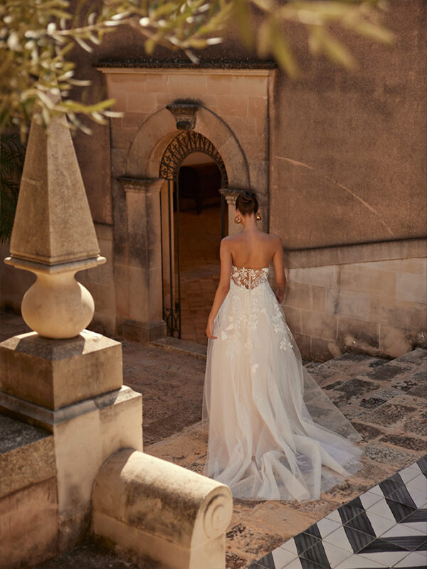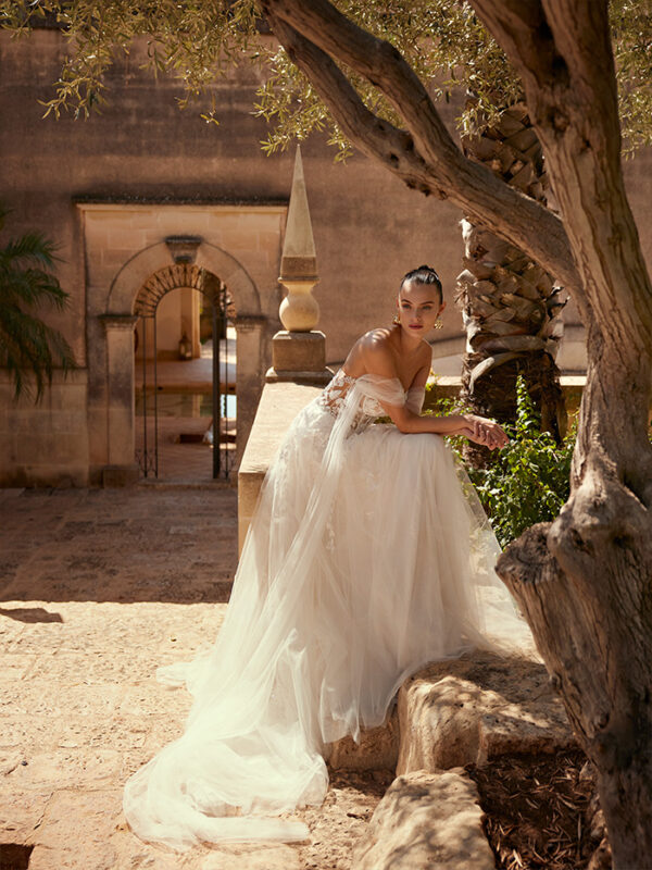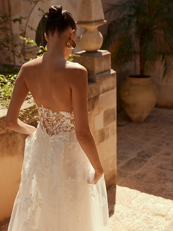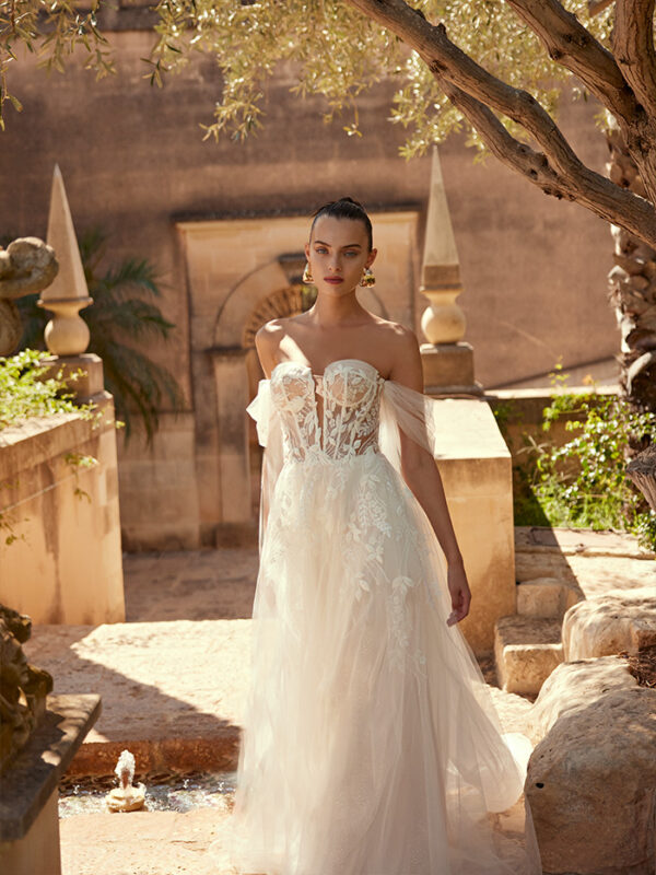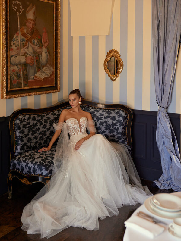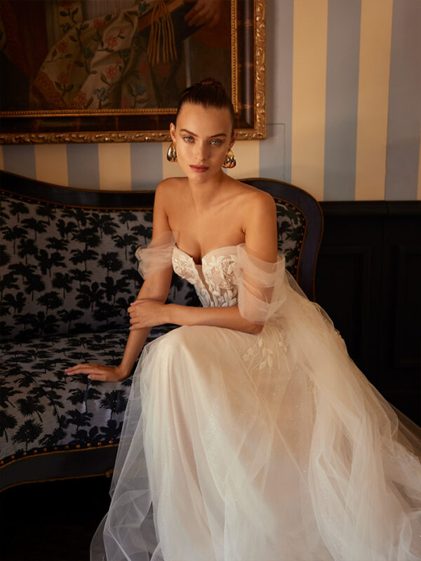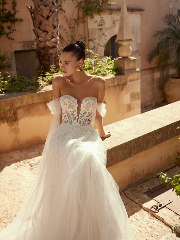 Το Elada είναι ένα νυφικό φόρεμα σε γραμμή Α, σχεδιασμένο για να κλέψει τα φώτα της δημοσιότητας! Η τολμηρή λαιμόκοψη με σχήμα καρδιάς τονίζει τη σιλουέτα, ενώ το μπούστο από δαντέλα είναι διακοσμημένο με λαμπερές πούλιες. Το νυφικό διαθέτει αποσπώμενες τιράντες στους ώμους, επιτρέποντάς σας να προσαρμόσετε την βραδινή εμφάνισή σας.
